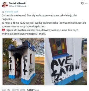 W nocy z 18 na 19 października 2025 r doszło do bulwersującego aktu wandalizmu w małej mazowieckiej wsi. Zabytkowa kapliczka poświęcona Matce Bożej, symbol wiary i lokalnej tradycji, została totalnie zdewastowana. To zdarzenie, o którym poinformował poseł Daniel Milewski na platformie X, budzi głęboki smutek wśród wiernych i przypomina o rosnącej potrzebie ochrony sakralnych zabytków w Polsce.
